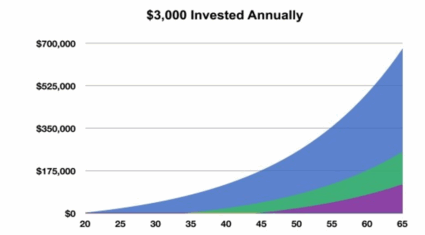 For example, let’s say that your goal is to retire at age At age 20 you begin contributing $3,000 per year to your tax-deferred 401(k) account. If your investment earns 6% per year, compounded annually, you’ll have approximately $679,000 in your investment account when you retire.